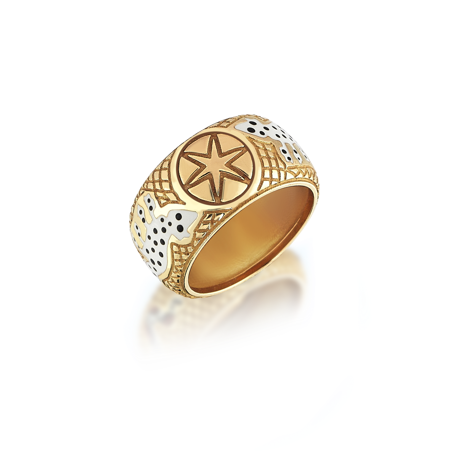 Eski çağlardan kalma mağara çizimlerinden, müzelerde sergilenen antik buluntulardan esinle tasarladığımız bir mini altın yüzük serisi bulunuyor. Kurti kaplan, yılan ve panter desenlerini çevreleyen işaretler, yıldızlar, çizgiler arkeolojiye ve geçmişe gönderme yapıyor.