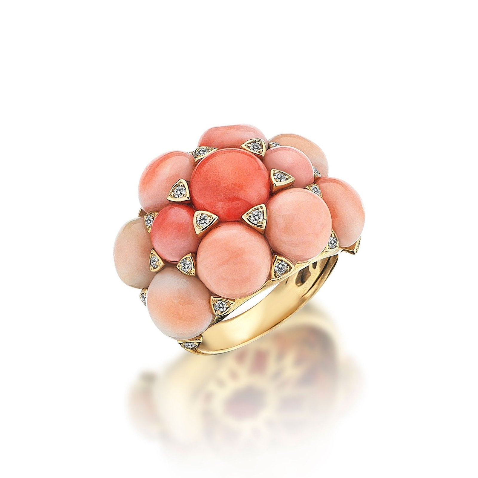 Doğal mercanın verdiği renk geçişlerinde açıktan koyuya uzanan renk skalasına sahip. Pink Bouquet adlı altın ve mercan yüzüğümüz “tek parça yeter” diyenlerin tercih edeceği bir tasarım.