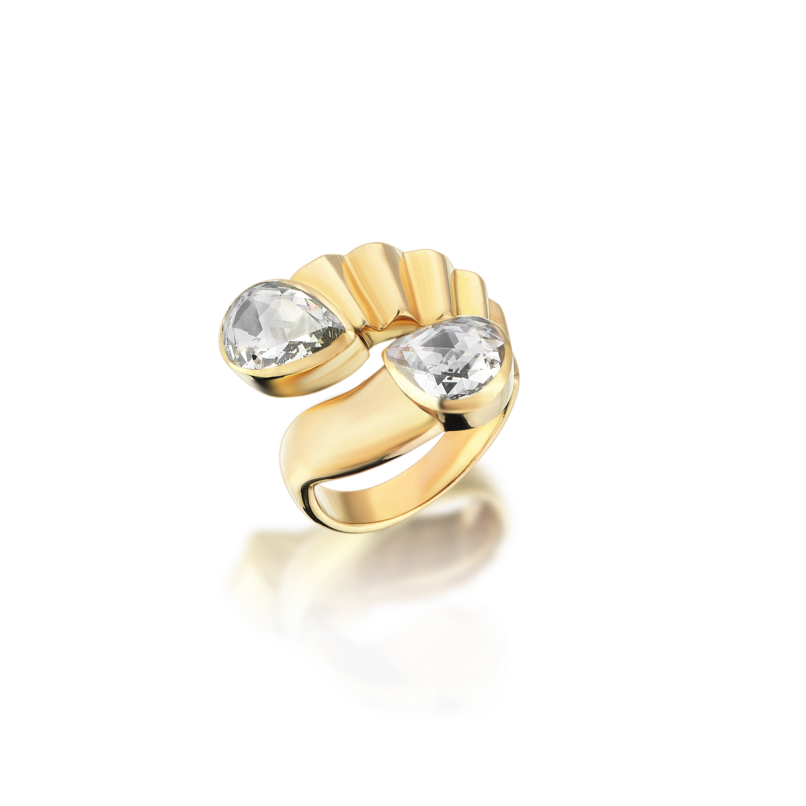 Evlilik teklifi ya da düğün hediyesi olarak eşsiz bir altın ve pırlanta yüzük tasarımı… Bir kolu üzerindeki küçük basamaklar evliliğe giden yolda atılan adımları simgeliyor.