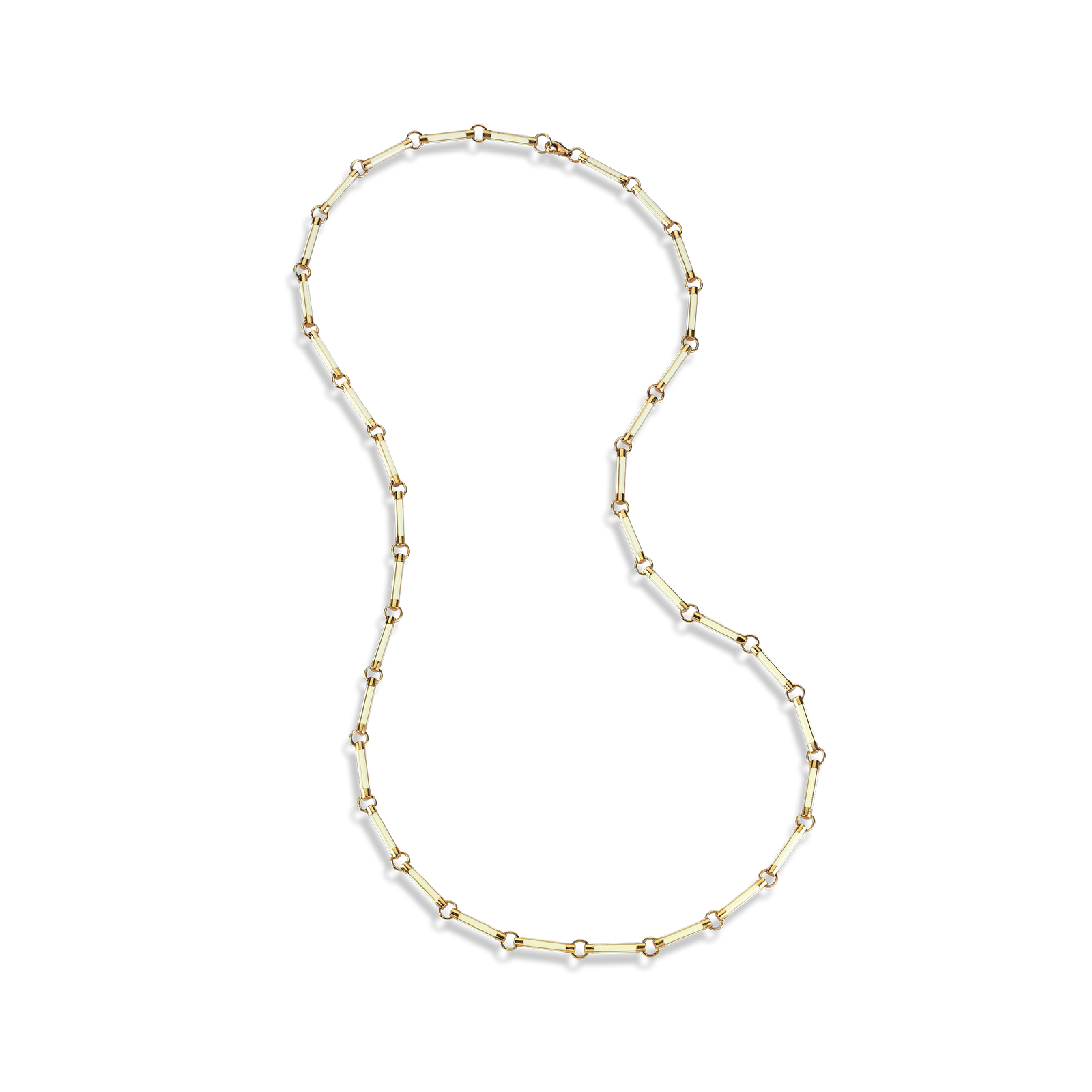 Kalın ve uzun altın zincirlerimize farklı bir yorum katarak mineyle bir araya getirdik. 68 cm uzunluğundaki Altın kolyenin siyah ve beyaz olmak üzere iki farklı versiyonu bulunuyor.