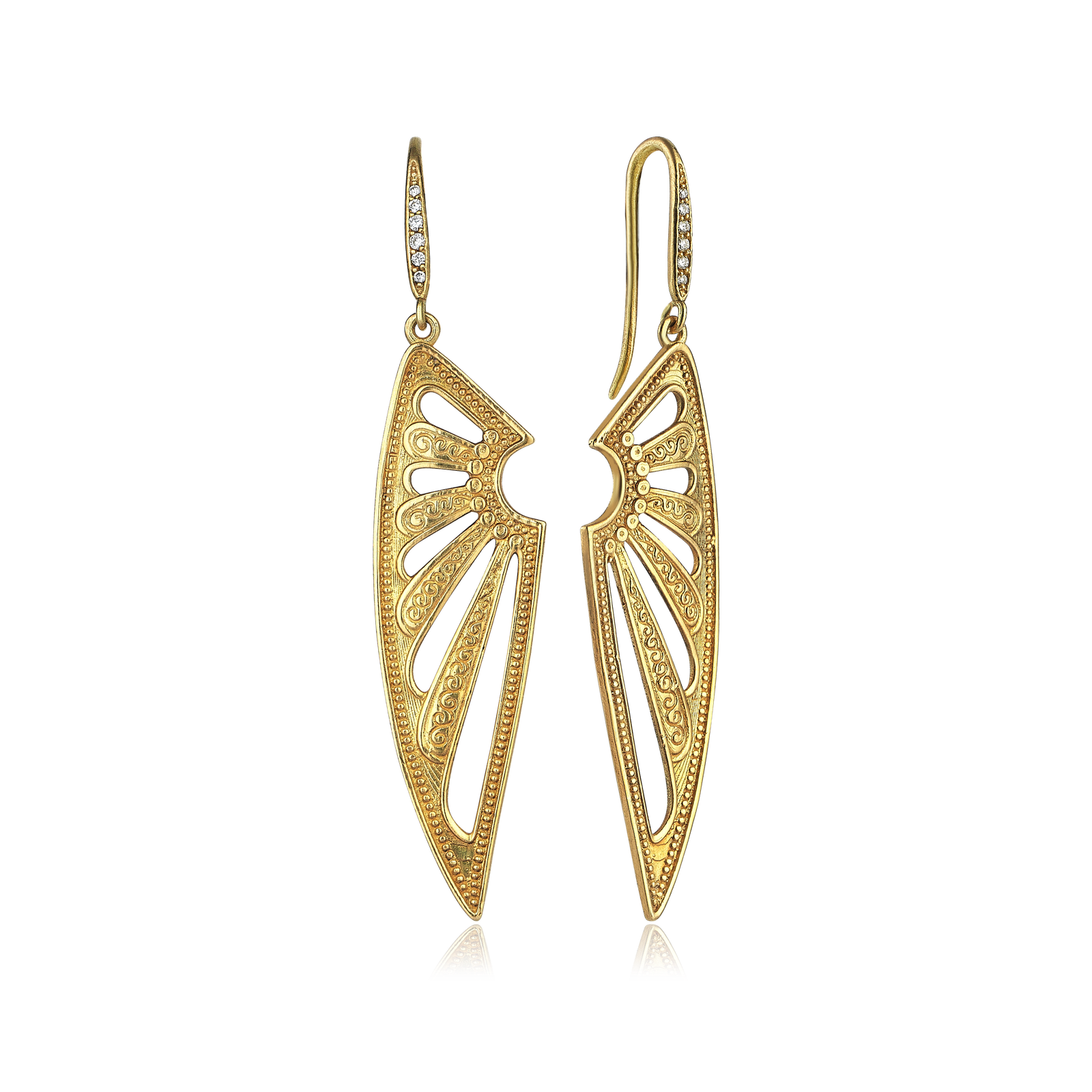 Eski çağların kahraman savaşçılarından esinlendiğimiz bu altın küpenin pırlantalı ve sallantılı modelinin yanı sıra pinli, sadece altın versiyonu da bulunuyor.